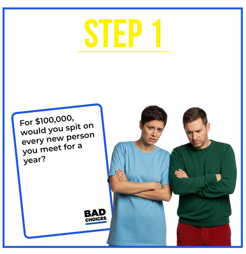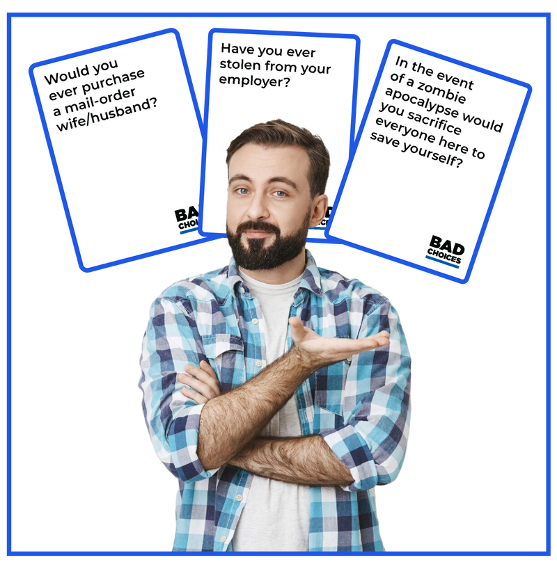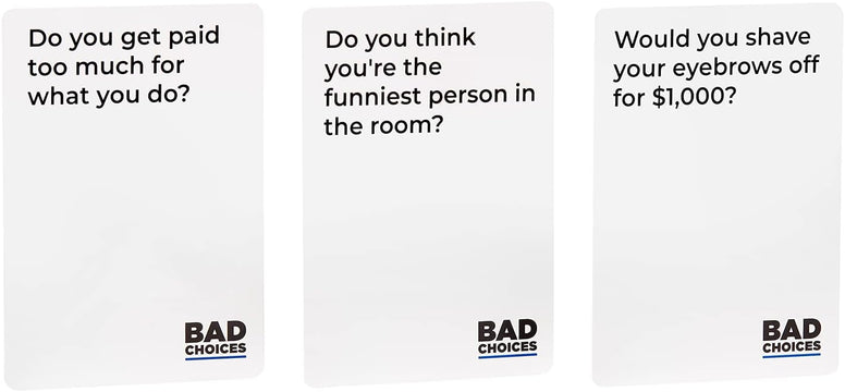 Bad Choices is the hilarious new adult party game that FORCES you to choose a question card, then strategically pinpoint the player mostly likely to answer YES.
