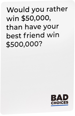 Bad Choices is the hilarious new adult party game that FORCES you to choose a question card, then strategically pinpoint the player mostly likely to answer YES.